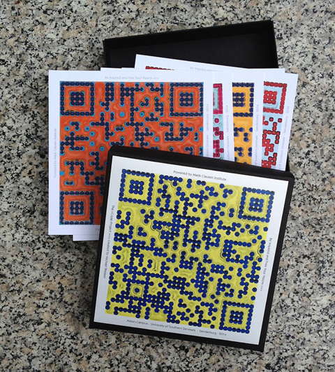 Die QR-Box "Free Your Visions" wurde im Format 17x17 cm als Wandobjekt konzipiert. Sie enthält fünf farbige i:Codes auf Dibondplatten kaschiert sowie eine Audio-CD mit musikalischen Werken der Formation "Software".